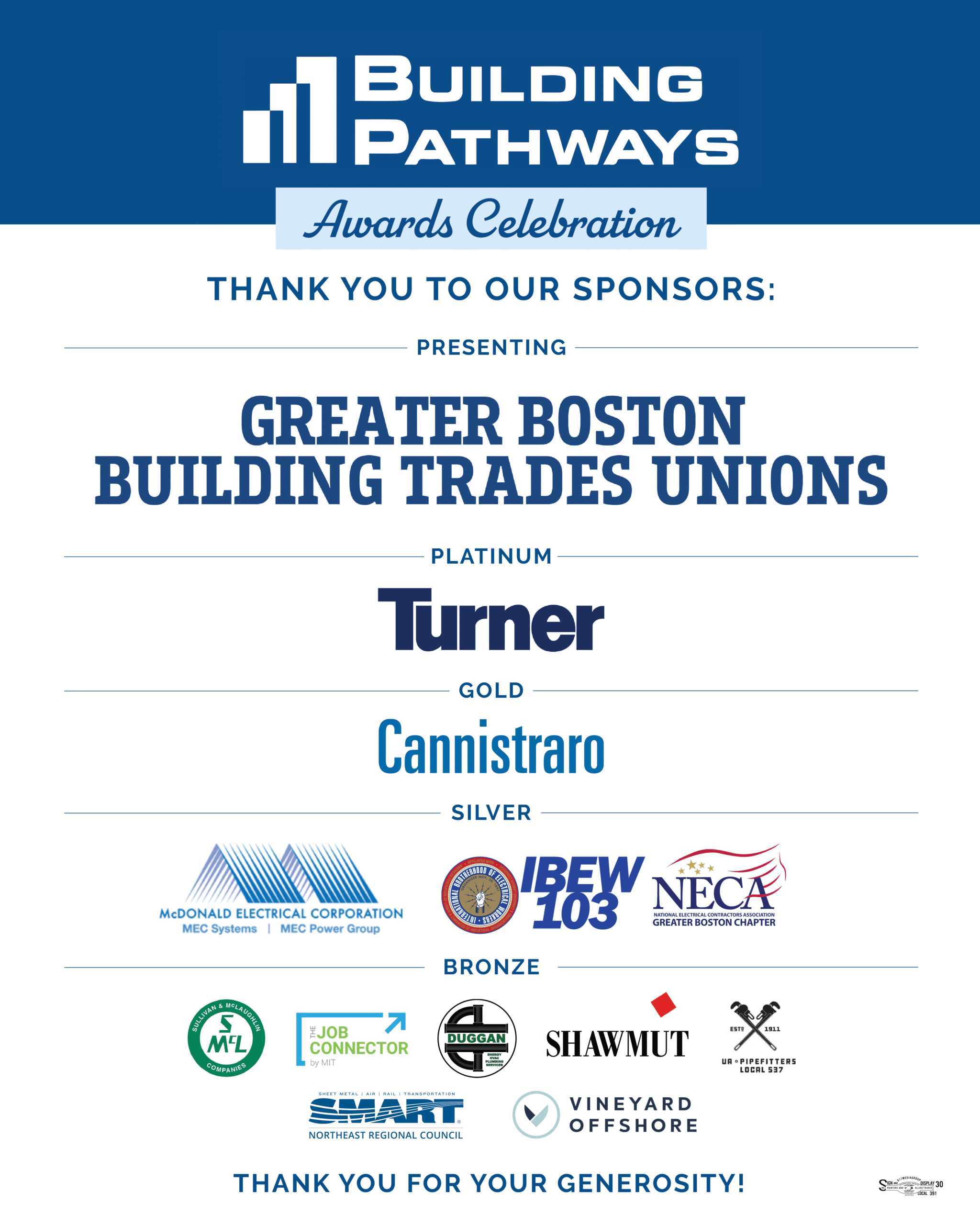 Building Pathways is having our annual awards celebration! Join us on Thursday, November 20 at IBEW Local 103 as we recognize our allies, partners, and graduates for helping us achieve our mission of bringing underrepresented communities into the union building trades. Without the support of our community and our sponsors, Building Pathways would not be able to fulfill our mission of increasing the recruitment, retention, and advancement of under-represented groups in the union building trades, particularly women, people of color, and young adults.